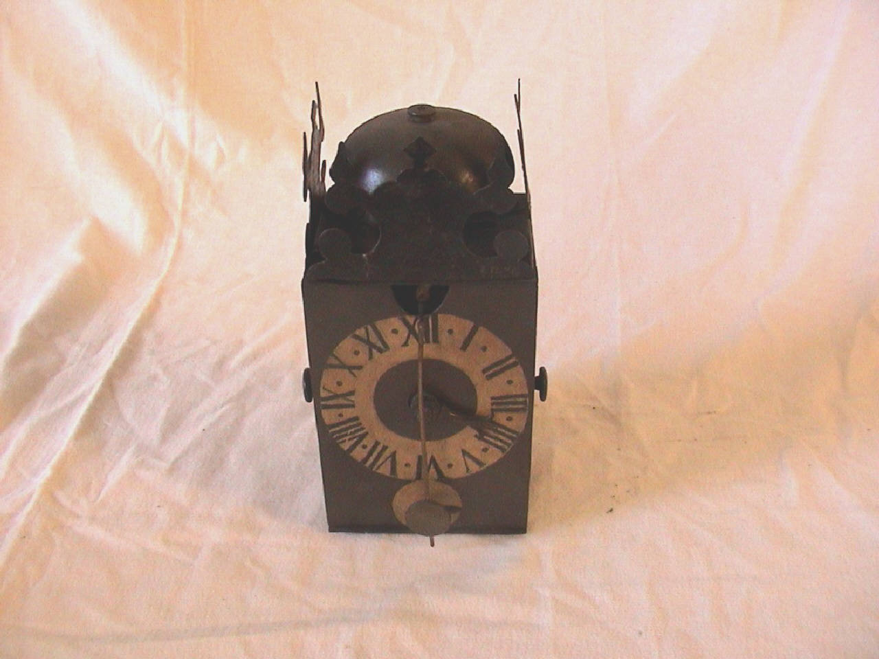 Cassa rettangolare in ferro con fondo e coperchio in ferro sormontata da una campana, sportellini laterali per l'ispezione del movimento.\nQuadrante dipinto con indicazione delle ore in caratteri romani. Lancetta ad alabarda. Scappamento a verga regolato da pendolo.