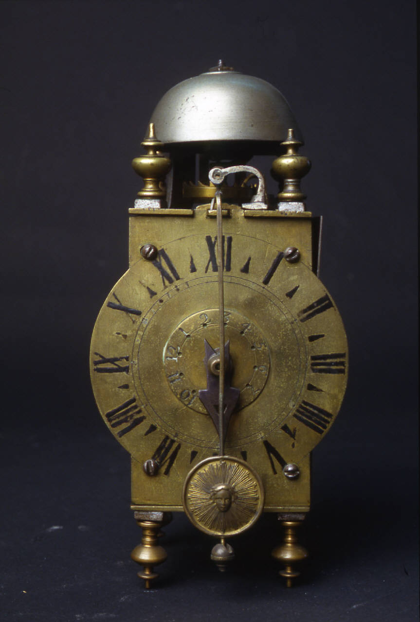 Cassa in ottone brunito con montanti in ferro che terminano da ambo i lati con pinnacoli torniti. Sportelli laterali per l'ispezione del movimento. Ai montanti posteriori è fissato un anello per poter appendere l'orologio.\nQuadrante in ottone con indicazione delle ore in caratteri romani. Piccolo quadrante al centro, con indicazione delle ore in cifre arabe, per la regolazione della sveglia.\nMovimento in ottone con scappamento a verga regolato da pendolo a "coda di vacca".
