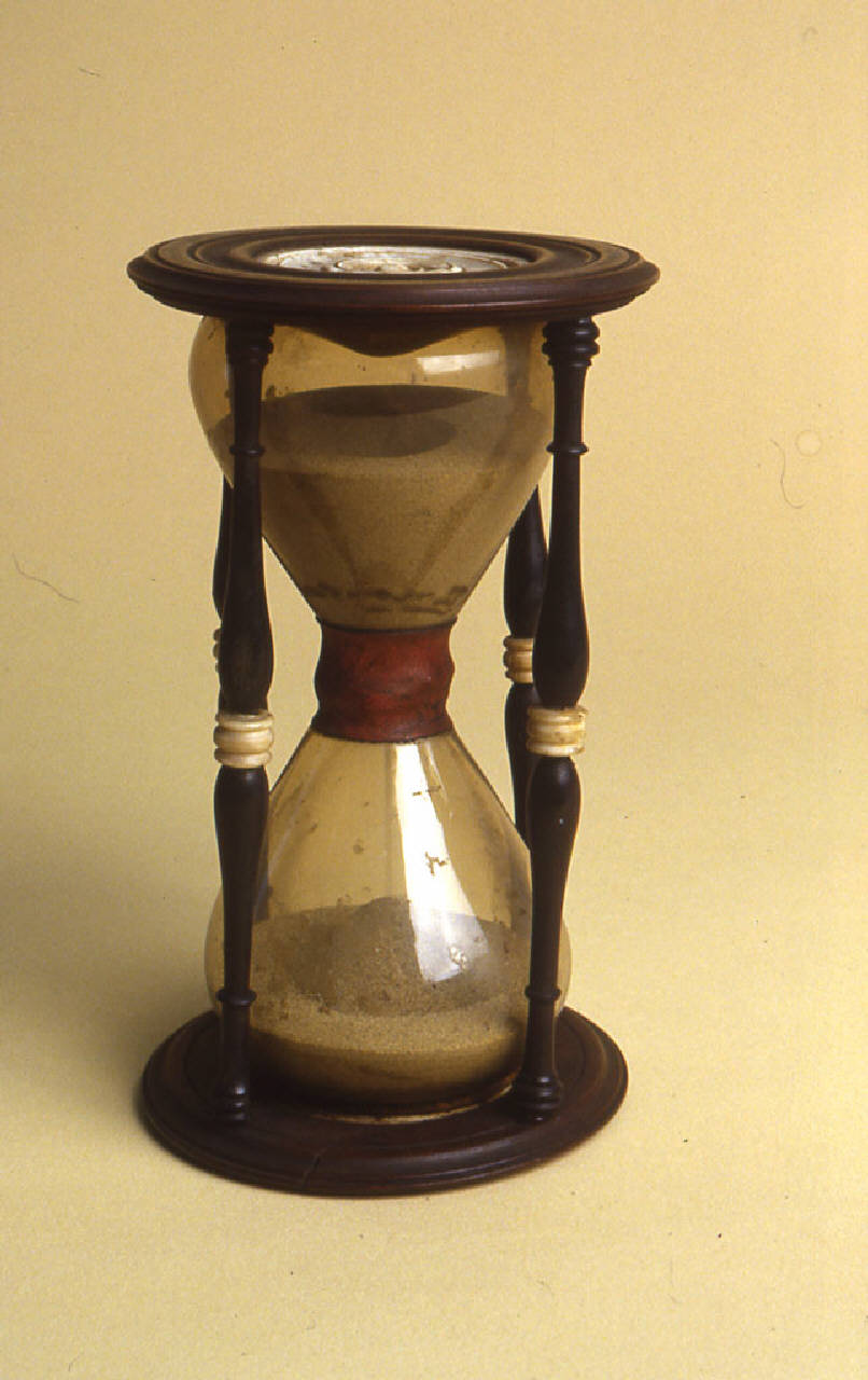 Orologio a sabbia con montatura in legno con quattro pilastrini a doppia colonna con giunto di avorio. Base con disco di avorio centrale con scanalature concentriche.