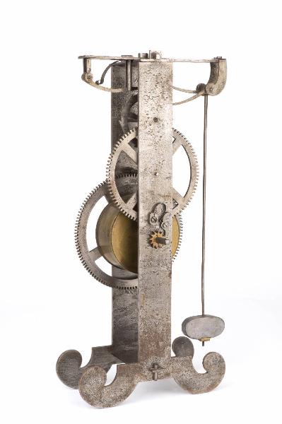 Struttura in ferro, con base a volute, aperta su due lati. All'interno vi sono alloggiati gli ingranaggi dello scappamento, due ruote dentate e una forza motrice rinchiusa in un corpo cilindrico in ottone (presumibilmente per il movimento delle lancette dei minuti e delle ore di un ipotetico quadrante). Lo scappamento è composto da una ruota a 12 denti con 12 pioli su un lato, sormontata da una leva di ritegno, e da due leve ricurve verso l'alto, quella superiore per lo svincolo della ruota di scappamento e mentre quella inferiore riceve l'impulso dai pioli posti a lato della stessa ruota, collegate al pendolo, con peso in piombo, posizionato su uno dei lati aperti.