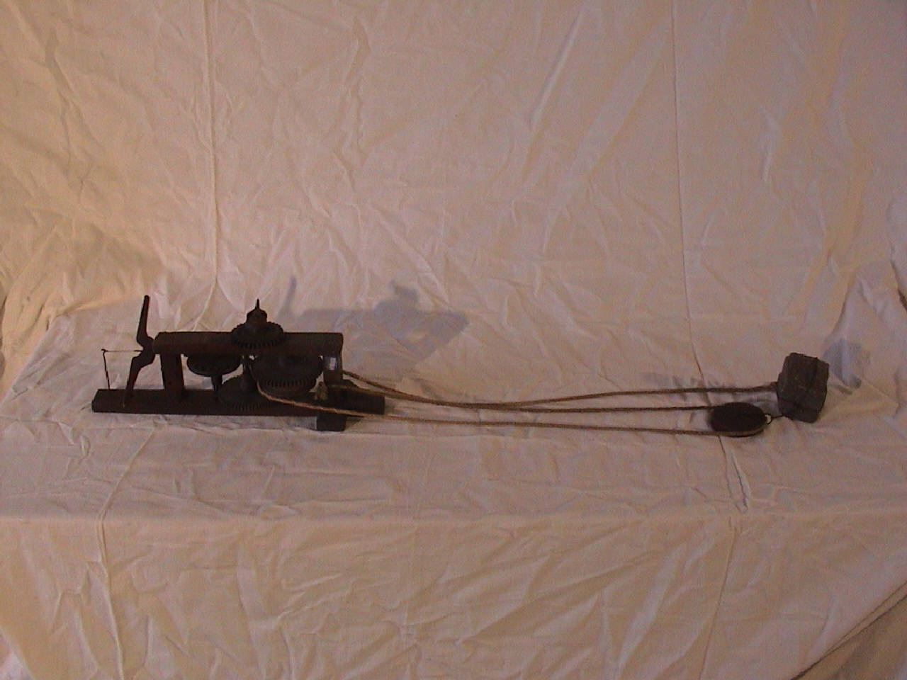 Ricostruzione di orologio con bilanciere a barra. Scappamento a verga con ruota a pioli, collegato alla forza motrice, a pesi, con un treno di due ruote. Mancante di quadrante ma con lancetta per l'indicazione delle ore.