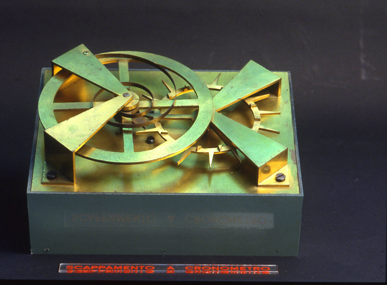 Modello didattico costruito per mostrare il funzionamento dello scappamento duplex. E' montato su tavoletta di ottone e dotato, originariamente, di un motorino posto sotto la base che garantiva la forza motrice all'ingranaggio. Lo scappamento è regolato da una bilanciere a spirale piana.\nIl duplex è dotato di una ruota scappamento con una doppia fila di denti: la prima, radiale, ha denti lunghi e appuntiti; la seconda, perpedicolare al bordo, ha denti corti. I denti corti ricevono l'impulso da una paletta posta sotto il bilanciere. I denti lunghi fermano la ruota agganciandosi ad un disco posto sotto l'albero del bilanciere. Ad ogni oscillazione i denti lunghi vengono liberati da una tacca del disco, la ruota riceve l'impulso tramite quelli corti e viene bloccata, dopo un piccolo avanzamento, da quelli lunghi.
