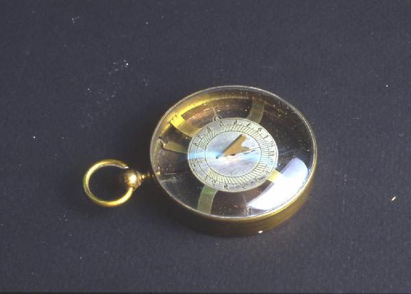 Cassa in ottone, pendente sferico con anello circolare. Gnomone triangolare. Sotto il quadrante è montata la bussola per il corretto orientamento dell'orologio.