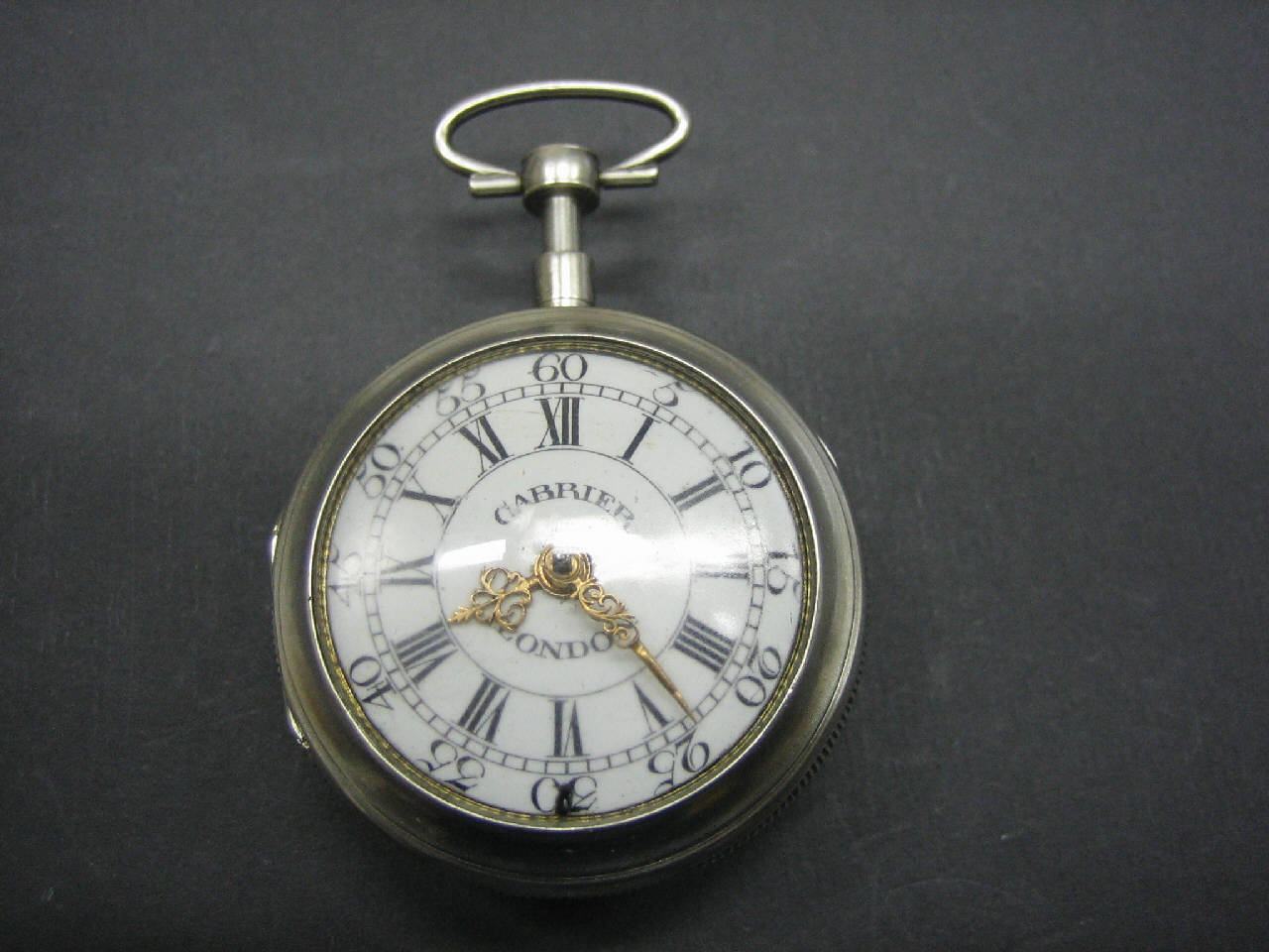 Cassa in tre parti: fondo liscio, cuvette liscia con supporto della campanella e foro di carica, lunetta portavetro. Pendente a disco con collo cilindrico a pressione per l'attivazione della ripetizione e anello ovale spinato.\nQuadrante in smalto bianco con indicazione delle ore in caratteri romani e indicazione dei minuti di cinque in cinque in cifre arabe. Lancette traforate.\nMovimento a platina intera con colonnini cilindrici. Conoide a catena. Scappamento a verga. Ponte bilanciere traforato e inciso a un piede con controperno in rubino e mascherone. Regolazione del tempo a chiavetta su quadrantino. Carica posteriore a chiavetta.