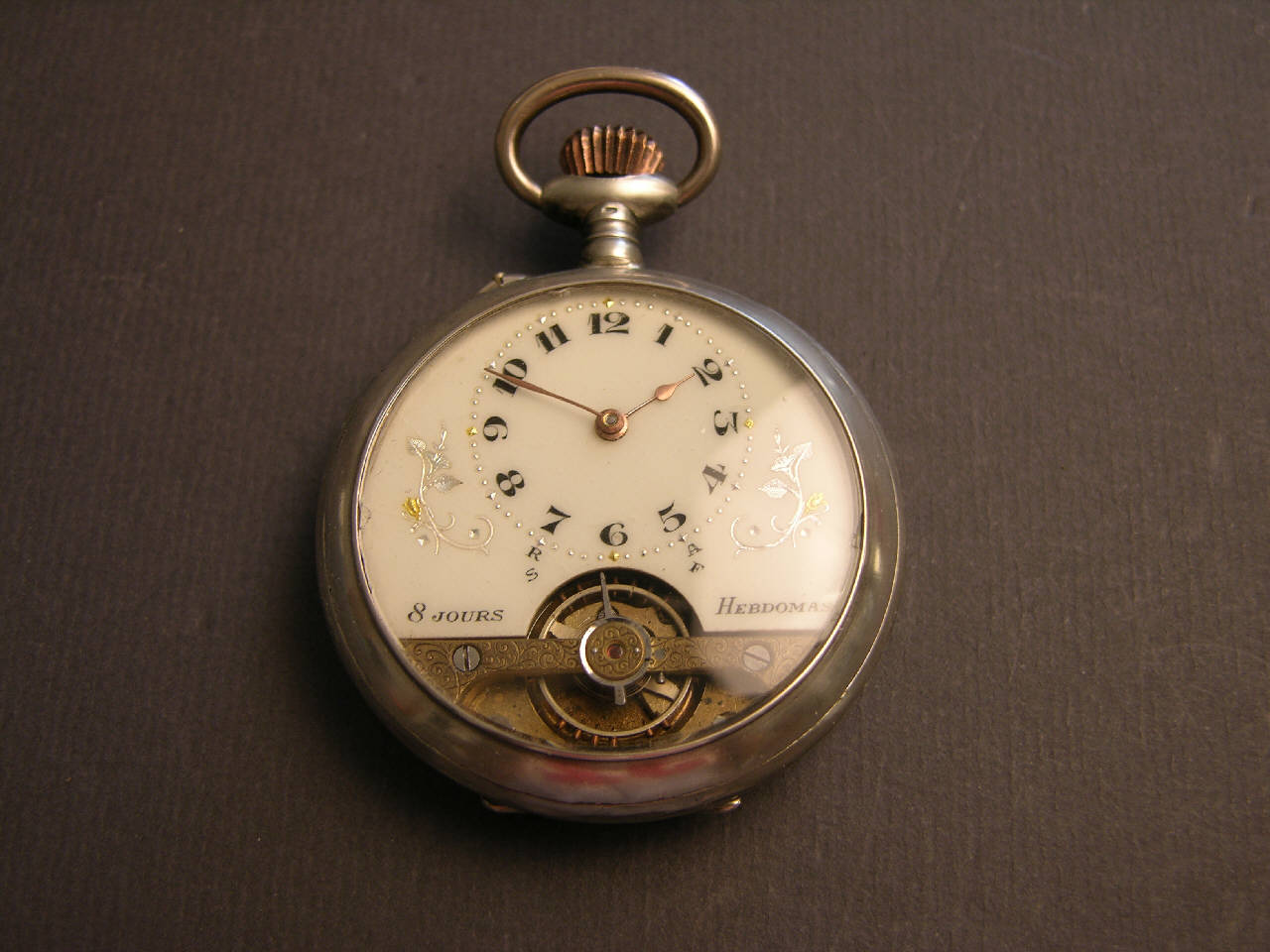 Cassa in argento in tre parti: fondo con decorazione a guillochet, carrure liscia e lunetta portavetro. Pendente a oliva con corona di carica e anello ovale inserito a pressione.\nQuadrante in smalto bianco con quadrante del tempo nella parte alta con indicazione delle ore in cifre arabe. Lancette a pera. Nella parte bassa il quadrante è tagliato per rendere visibile il bilanciere.\nMovimento a ponti separati. Bariletto di carica che occupa tutta la parte posteriore della cassa. Scappamento ad ancora. Bilanciere monometallico con viti di regolazione. Regolazione del tempo a racchetta che utilliza come settore graduato i punti dei minuti tra venticinque e trentacinque; doppia indicazione Avance/Retard, Slow/Fast. Carica a remontoire.