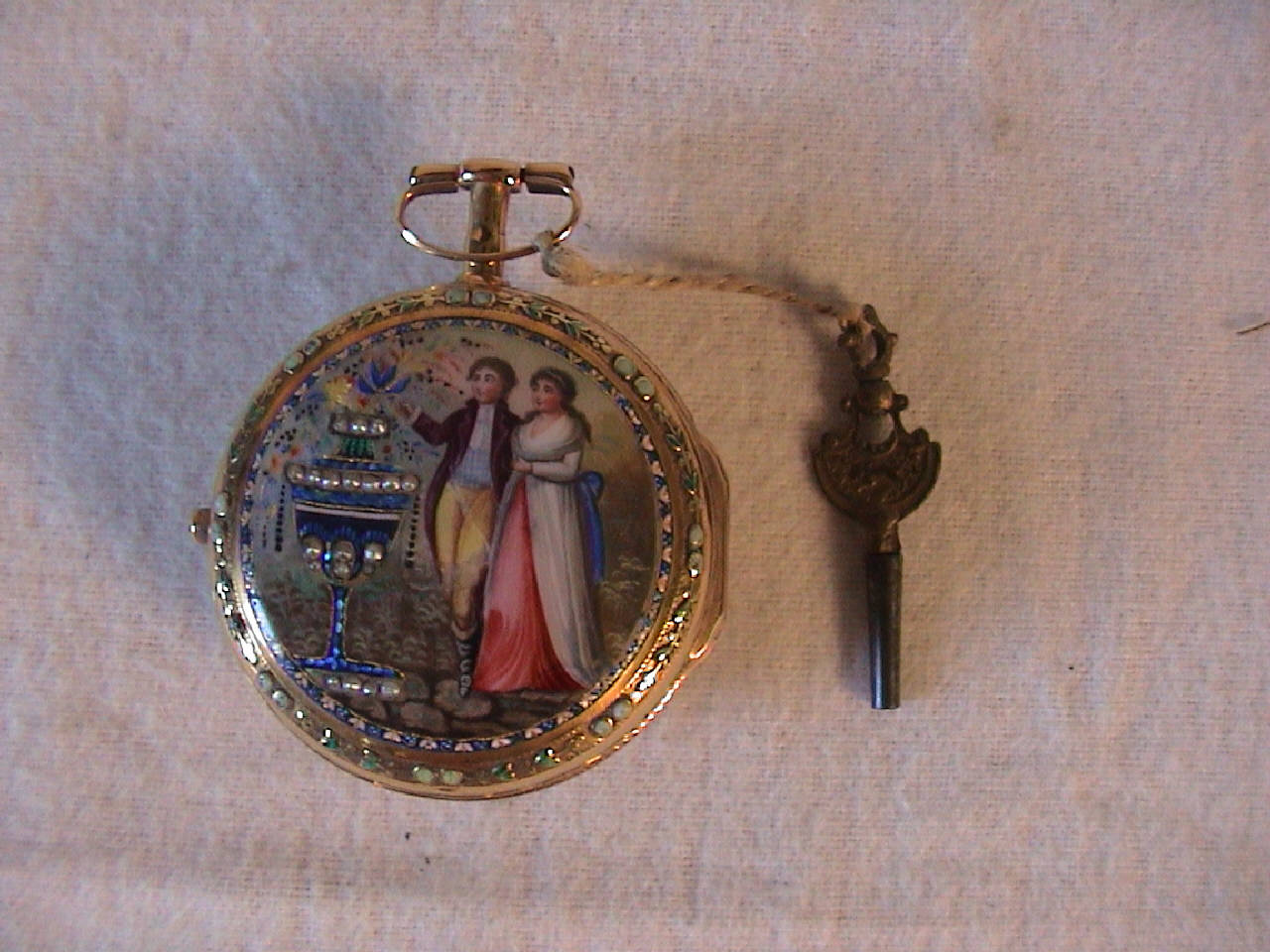 Doppia cassa: controcassa con pittura a smalto e lunetta incisa e cassa liscia. Cassa in due parti: fondo liscio con foro di carica e lunetta portavetro. Pendente a disco con collo cilindrico e anello ovale.\nQuadrante in smalto bianco con indicazione delle ore in caratteri romani e dei minuti, di cinque in cinque, in cifre arabe. Lancette traforate.\nMovimento a platina intera con colonnini cilindrici. Conoide a catena. Scappamento a verga. Ponte bilanciere traforato e inciso a due piedi con controperno in acciaio. Regolazione del tempo a racchetta su quadrantino. Carica a chiavetta posteriore.