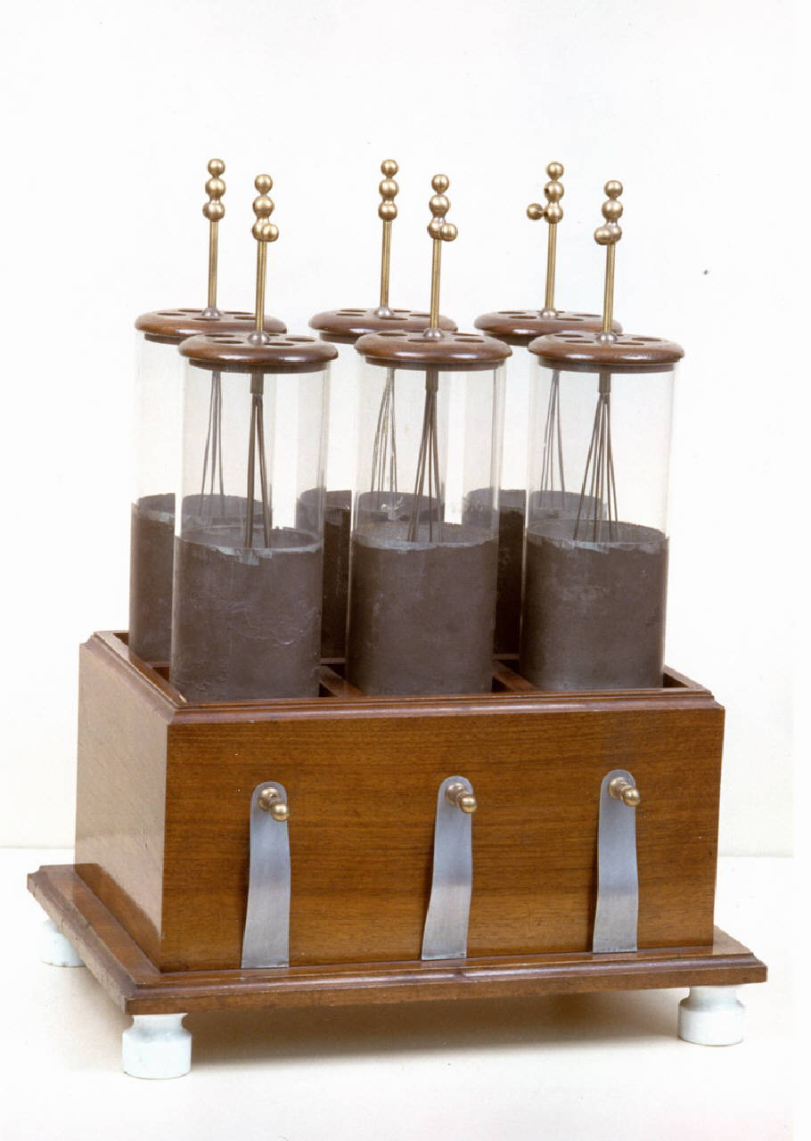 E' formata da una scatola in legno con piedini ceramici. La scatola è divisa a scacchiera con 6 allogiamenti, all'interno dei quali risiedono 6 bottiglie di Leida a forma cilindrica. Ogni bottiglia è realizzata in vetro, un'armatura esterna e una interna in stagnola e un tappo in legno forato che ospita un elettrodo. L'elettrodo in ottone penetra nella bottiglia con aste di conttatto e fuoriesce nella parte superiore con uno stelo alla cui sommità è posto il serrafilo. Sul fondo di ogni allogiamento vi è un disco in metallo. Tutti questi dischi terminano all'esterno della scatola (sul lato più lungo) con una lamiera ripiegata e fissata alla scatola con dei fissacavi.