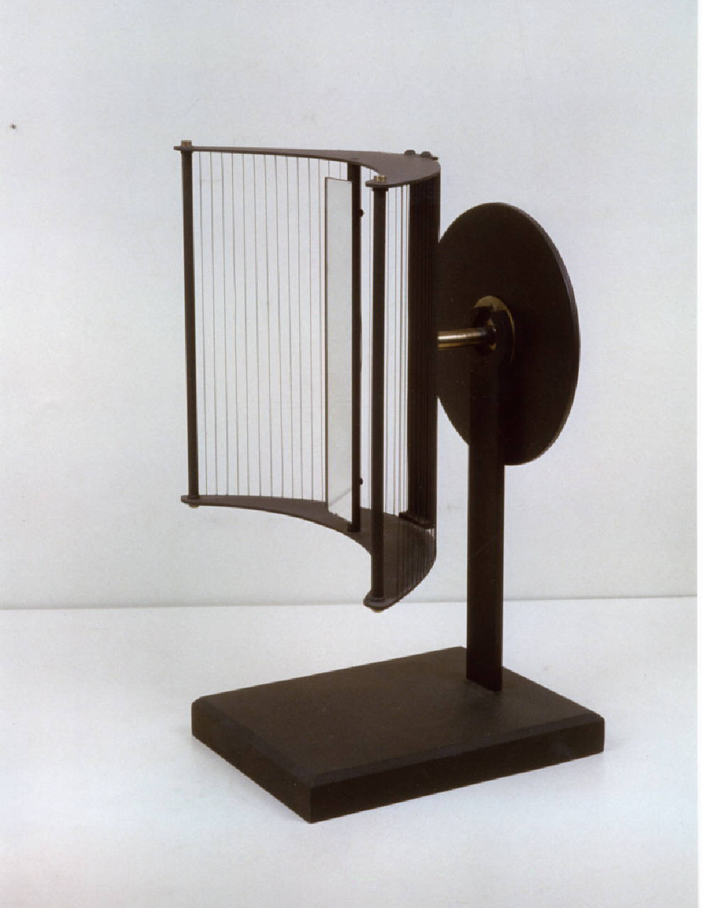 Un sostegno in ferro, fissato su di una base rettangolare in legno verniciato, ospita una parabola con profilo composto da fili metallici. Nel fuoco della parabola è fissato il rivelatore del tipo a specchio con argentatura intagliata. La parabola e il rivelatore ad esso solidale sono liberi di ruotare intorno al perno di accopiamento con il sostegno in ferro. Dietro al sostegno in ferro e solidale con esso è presente una scala circolare graduta (da 0° a 360°). Una lancetta in ottone calettata sull'albero di rotazione della parabola indica l'iclinazione della parabola e del rivelatore. \nTrattandosi di una ricostruzione a fini espositivi questo strumento non è mai stato utilizzato per nessun esperimento: il rivelatore manca del fondamentale intaglio nell'argentatura dello specchio.