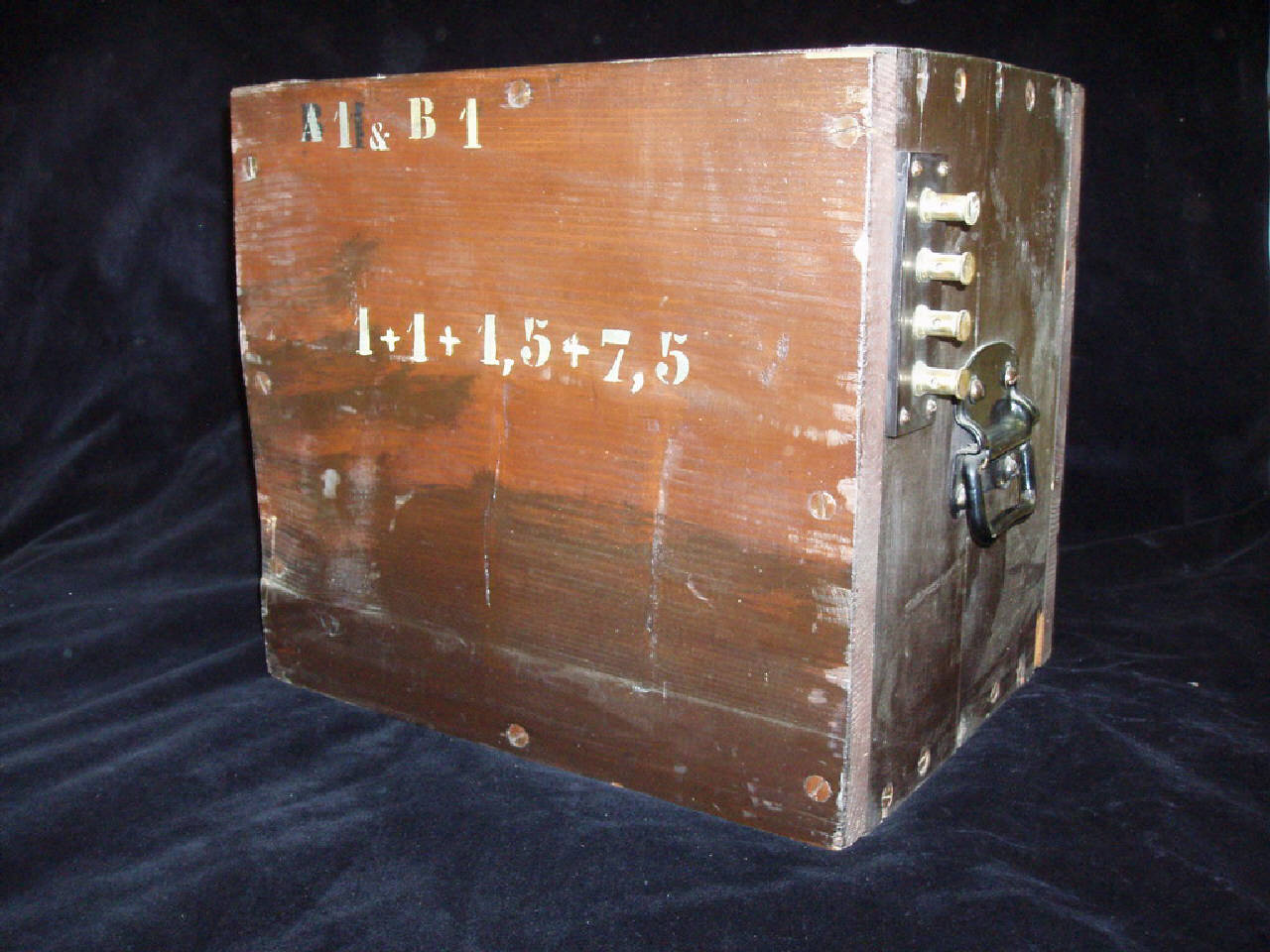 Questo condensatore è costituito da una scatola in legno con maniglie in ferro. Sui due lati sono presenti rispettivamente 1 e 4 serrafili per il collegamento elettrico. Al suo interno sono presenti, alternati, fogli di stagno e carta paraffinata. Riportiamo la descrizione di questo elemento circuitale dell'ingegner Magni nella sua pubblicazione del 1912 (pag. 16): " Condensatori: come si disse, si usarono dei condensatori appositamente costrutti dalla Ditta Campostano a sezioni di circa 1x1x1,5x7,5 mf. con fogli di stagno puro intercalato con fogli di carta paraffinata. Ne ebbi a disposizione quattro. Essendo piuttisto voluminosi e pesanti furono muniti di maniglie laterali a guisa di bauletti per comodità di trasporto."