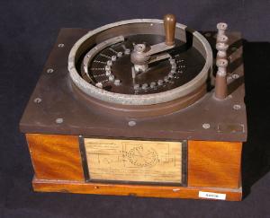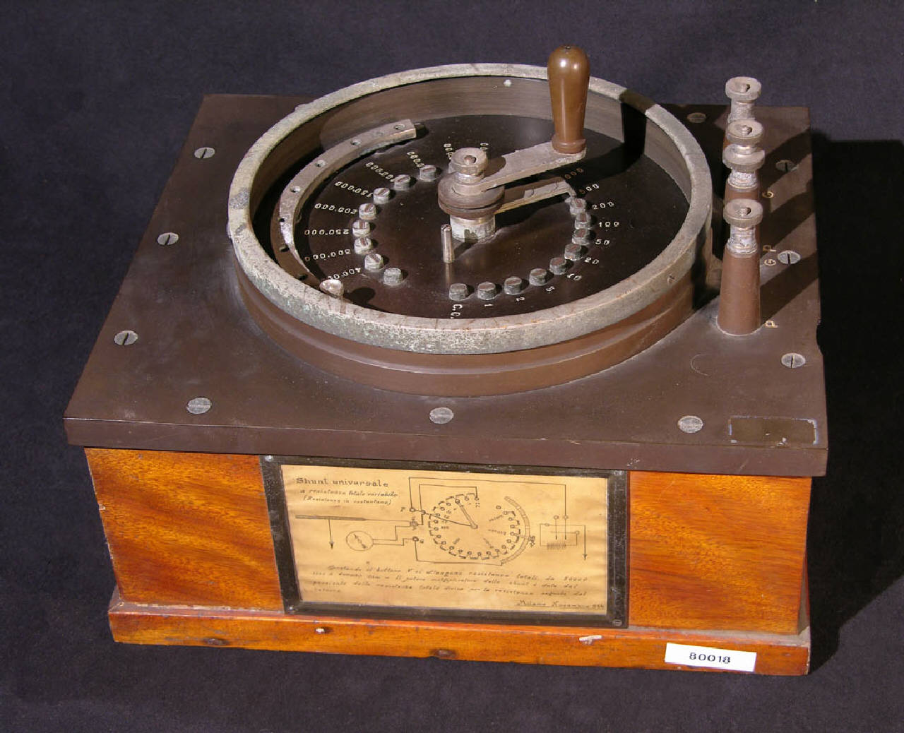 E' un classico strumento per elettrotecnica dell'inizio del secolo scorso dalle tipiche caratteristiche costruttive. E' costituito da una scatola in legno a sezione quadrata chiusa nella parte alta da una spessa lastra di bachelite; questa è collegata alla struttura in legno sottostante per mezzo di dodici viti. Sulla lastra sono fissati lungo uno dei quattro lati tre morsetti per i collegamenti elettrici. Tutta l'area centrale è invece occupata dal cursore a manovella per la selezione della resistenza desiderata. Questa operazione si otteneva mettendo la parte metallica di cui era composta la manovella in contatto con il terminale in questione. Lo strumento è caratterizzato da 23 terminali disposti circolarmente attorno al perno della manovella; ognuno di essi, quindi, poteva essere facilmente raggiunto, e quindi attivato, ruotando opportunamente la manopola di selezione. \nSu un lato della scatola è incollato lo schema elettrico dello strumento disegnato su carta.
