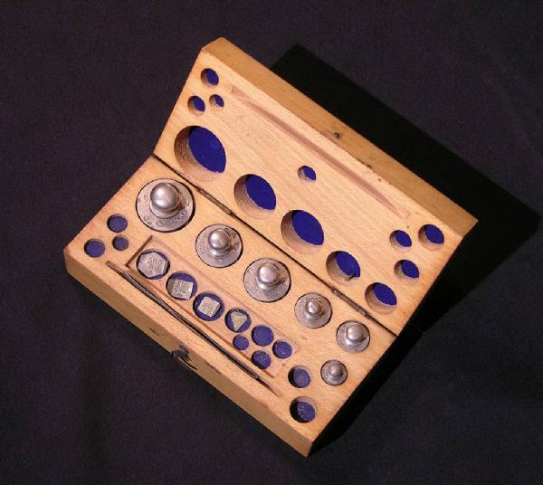 Piccola scatola in legno con all'interno un set di pesi campione in metallo. Questi si presentano sia nella classica forma cilindrica con pomello di presa che sotto forma di foglioline metalliche. I primi sono inseriti in fori ricavati scavando direttamente il legno della scatola, le seconde sono poggiate entro piccole sedi circolari ricoperte di velluto blu e chiuse da una finestrella in vetr. E' presente anche una pinzetta utile per maneggiare i pesini più piccoli. La completezza del set di pesi deve essere verificata.\nLa scatola è chiusa da un semplice gancino.