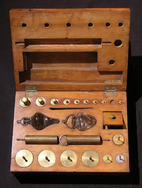 Lo strumento è contenuto nella sua scatola originale in legno. E' composto da vari pezzi tutti di dimensioni relativamente piccole. Tra questi, due tubicini cavi in ottone a sezione cilindrica chiusi ad una estremità. Uno di essi è leggermente più grande e possiede, dallo stesso lato ove è aperto, un piccolo archetto a forma di maniglia, forse utilizzato per la sospensione. Entrambi i tubicini dispongono di un piccolo gancio attaccato esattamente nel centro della base chiusa. Sono presenti molti pesi campione (circa una ventina) e due contrappesi in vetro di forma vagamente conica con struttura di sospensione in filo metallico. Vi è anche una pinzetta per la presa dei pesi più piccoli.