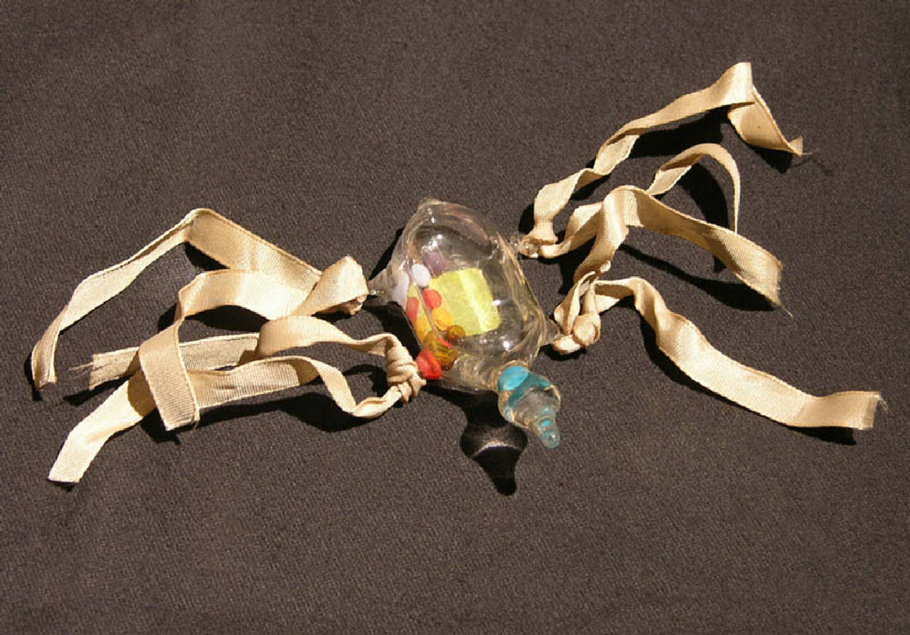 Termometro molto particolare costituito da una piccola ampolla di vetro dalla forma che ricorda quella di animale acquatico. Al suo interno è presente un liquido (acquarzente) in cui sono immersi alcuni piccoli frammenti di materiale colorato. Alle zampe dell'animale sono legati quattro nastrini in stoffa.