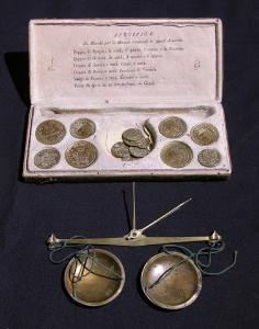L'oggetto è composto da un astuccio in legno ricoperto di pelle che è chiudibile per mezzo di due piccoli gancini frontali; uno di questi, però, è oggi mancante. Al suo interno è collocata una bilancina a due piatti per la pesatura di monete o piccole quantità di materiale prezioso. I due piattini sono agganciati alle estremità opposte del braccio della bilancia ognuna per mezzo di tre fili di cotone o di seta. La bilancia poteva essere sorretta tenendola per un'astina incernierata nella parte centrale del braccio primario mentre la posizione di equilibrio veniva determinata grazie a una seconda astina solidale al braccio stesso.\nNella parte interna del coperchio della scatola sono elencati i pesi in dotazione. Nell'astuccio sono, infatti, presenti alcuni pesi campione costituiti da esemplari di monete di diversa nazionalità.