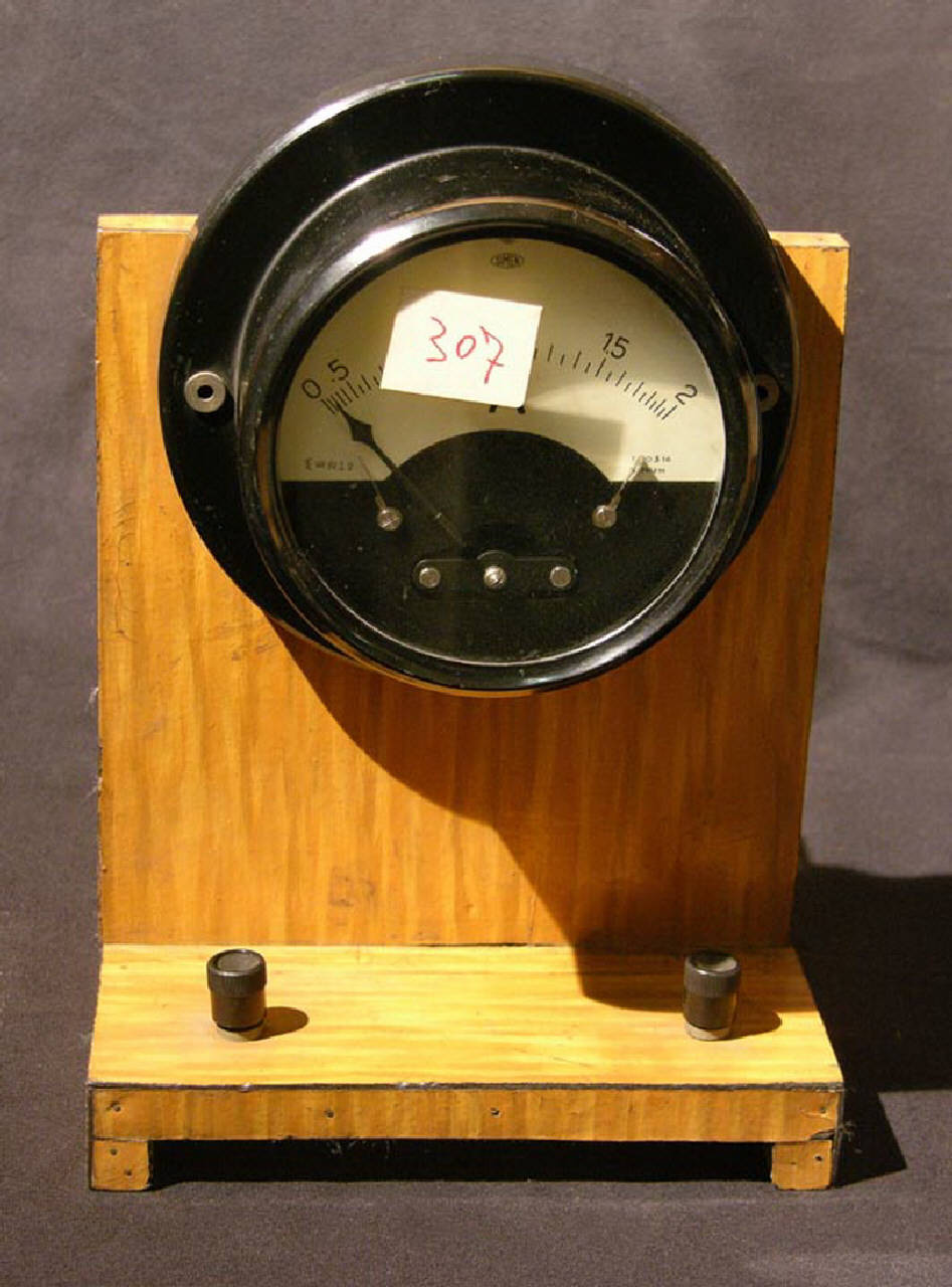 Tipico strumento di misura elettrico di forma circolare, è montato su un supporto in legno per consentirne l'utilizzo in un laboratorio didattico. La struttura principale è sostanzialmente metallica ma lo strumento è caratterizzato da una finestrella in vetro, anch'essa di forma circolare, attraverso la quale è possibile effettuare la lettura della grandezza fisica misurata, in questo caso l'intensità di corrente elettrica. \nL'indice per la lettura scorre su una scala graduata, che ha la forma di un arco di circonferenza, permette ndo misure tra 0 e 2 Ampere.\nSulla base in legno che funge da supporto sono posizionati i due morsetti ai quali collegare gli estremi del circuito da misurare.