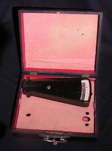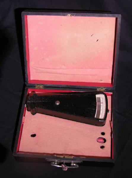 Lo strumento è di forma vagamente simile ad un triangolo isoscele troncato in punta ed è in metallo zigrinato sulla superficie. Dalla parte del lato corto del triangolo. che è leggermente arcuato, è presente una scala graduata protetta da un vetrino. La scala va da 0 a 25 con tacche ogni 0,2 ed è letta per mezzo di un indice a lancetta. Dalla stessa parte di questa scala, ma nello spessore dello strumento, è inserita una piccola vite per la taratura. Una vite analoga si trova dalla parte opposta mentre una terza vite di regolazione è collocata nel centro della faccia superiore dello strumento poco sotto la finestra della scala graduata.\nLo strumento è conservato nella sua scatola originale in legno rivestita internamente di velluto rosso. Al suo interno sono conservate altre parti dello strumento fornite in dotazione; sostanzialmente si tratta di tre astine metalliche, indispensabili per poter utilizzare correttamente lo strumento e compiere la misura. Forse ve ne era in dotazione anche una quarta dato che nella scatola è predisposto lo spazio necessario ad ospitarla.\nLa scatola presenta chiaramente la sede per un secondo strumento, probabilmente del tutto simile a quello qui descritto, che però è mancante.