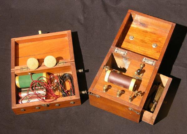 L'oggetto è composto da più pezzi distinti conservati all'interno di due piccole scatole in legno. In una è ospitato lo strumento principale, nell'altra sono riposti alcuni accessori. Lo strumento principale è costituito da un rocchetto elettrico incastrato in una base di legno inserita perfettamente nella scatola che lo ospita. E' sufficiente aprire il coperchio di quest'ultima per mettere in posizione di utilizzo l'apparecchio. Sulla base che ospita il rocchetto sono presenti alcuni connettori metallici per i collegamenti elettrici, una vite micrometrica di regolazione del rocchetto stesso e un interruttore a leva. Nella base della scatola è ricavato un cassettino apribile dall'esterno con riposti alcuni piccoli accessori.\nNella seconda scatola sono conservati gli elettrodi, i cavetti di connessione, i tamponi medicali e un secondo rocchetto. Sul bordo della scatola sono presenti alcuni connettori per i collegamenti elettrici.