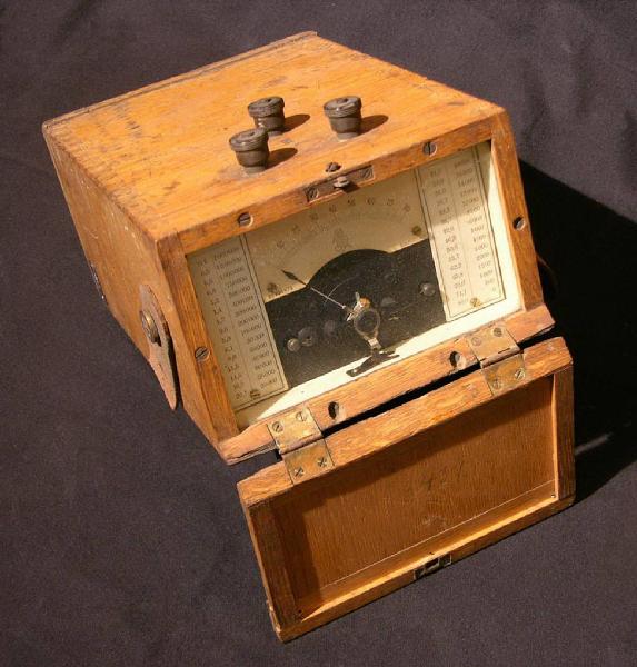 Antico strumento di misura estremamente elegante composto da una scatola in legno di forma parallelepipeda all'interno della quale è presente l'apparecchiatura vera e propria; questa, per essere utilizzata, non necessitava di essere estratta dalla scatola dato che quest'ultima svolgeva al contempo la funzione di contenitore e di struttura portante e di protezione.\nUna volta aperto il coperchio, che è in pratica una delle due facce piccole della scatola, appare il quadro di lettura, grande quanto la sezione della scatola e protetto da un vetro. Al centro è presente la scala graduata, con lancetta di lettura, che è arcuata e che permette la misura di valori compresi fra 0 e 80 con tacche ogni unità. Ai lati due tabelle riportano le quantità per la conversione fra il valore letto e la grandezza fisica misurata.\nSu uno dei lati della scatola sono presenti tre connettori per i collegamenti elettrici.\nLa maniglia in cuoio che permetteva il trasporto dello strumento è purtroppo rotta.