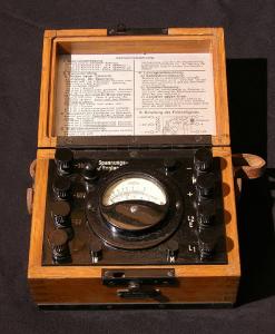 Strumento di misura particolarmente interessante dal punto di vista costruttivo. E' composto da una scatola in legno a forma di parallelepipedo all'interno della quale è collocata l'apparecchiatura vera e propria. Questa, per essere utilizzata, non veniva estratta dalla scatola dato che essa svolgeva la duplice funzione di contenitore protettivo e di struttura portante.\nSollevato il coperchio, che è in pratica una delle due facce maggiori della scatola, incernierata per il lato lungo, appare il quadro di comando e di lettura grande quanto la sezione della scatola. Al centro è presente l'apparecchio di forma circolare per la misura dei valori in gioco; è dotato di una lancetta di lettura mentre la suddivisione è caratterizzata da due scale numeriche crescenti in senso opposto. Sul quadro sono anche presenti otto morsetti per i collegamenti elettrici e tre piccoli pulsanti di comando.\nAll'interno del coperchio è incollato un foglio di carta sul quale è riprodotto lo schema elettrico dell'apparato insieme ad alcune istruzioni in tedesco. La scatola è dotata di maniglia in cuoio per facilitarne il trasporto.
