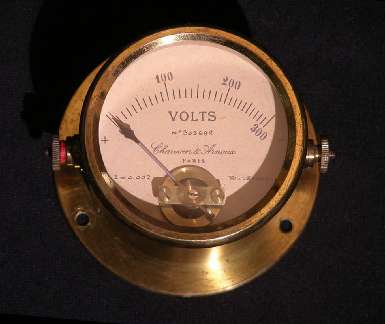 Bellissimo strumento di misurazione utilizzato per determinare la differenza di potenziale esistente ai capi di un circuito elettrico. Realizzato con struttura completamente in ottone, ha la classica forma circolare con quadro di lettura che occupa l'intera superficie superiore. Un vetro protegge lo strumento consentendo la lettura della scala graduata. Questa permetteva di effettuare misurazioni comprese tra 0 e 300 Volt con intervalli ogni 10 unità. La lancetta indicatrice è imperniata nella parte inferiore del quadrante.\nSulla parete cilindrica dello strumento sono collocati, in posizione diametralmente opposta, due morsetti per i collegamenti elettrici.\nLa cassa cilindrica che costituisce la struttura portante dello strumento termina dalla parte opposta alla finestra di lettura con una flangia che ne facilitava l'inserimento su un quadro di controllo generale.