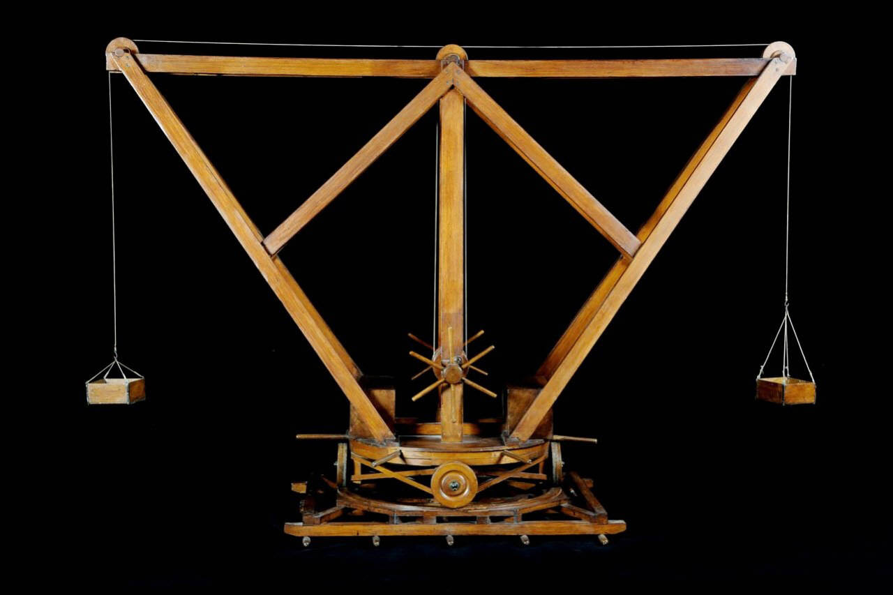 Il modello rappresenta una gru a doppio braccio montata su un piattaforma circolare. Quest'ultima può ruotare su se stessa grazie a ruote che scorrono su un binario circolare. La piattaforma è posta su un basamento appoggiato a tronchi di legno. Sui due bracci scorrono le casse portapesi, collegate tramite due corde a un rocchetto. Al rocchetto sono collegati due argani provvisti di meccanismo di arresto