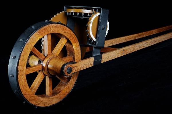 Il modello è costituito da una ruota di legno bordata di ferro. La ruota è montata tramite un asse a una struttura di sostegno con due lunghe barre. Sull'asse c'è un dente che ingrana una ruota dentata verticale, che con un solo dente ingrana una seconda ruota dentata orizzontale che a sua volta ingrana con due denti una terza ruota dentata verticale (opposta alla prima), dotata di un disco graduato.