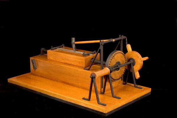 La macchina è costituita da una base in legno su cui scorre un carrello collegato a una vite senza fine, a sua volta collegata tramite ingranaggio e pignone a un albero di trasmissione. A una delle estremità dell'albero una ruota a quattro denti ingrana un perno a sua volta collegato a un martello. Sull'albero di trasmissione è collocato anche un rocchetto.