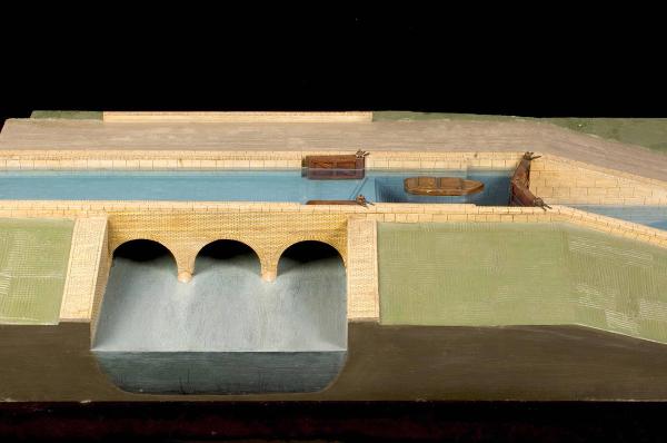 Il plastico rappresenta un canale navigabile che scavalca un corso d'acqua attraverso un ponte. Il canale, su cui è un'imbarcazione, è dotato di una conca.