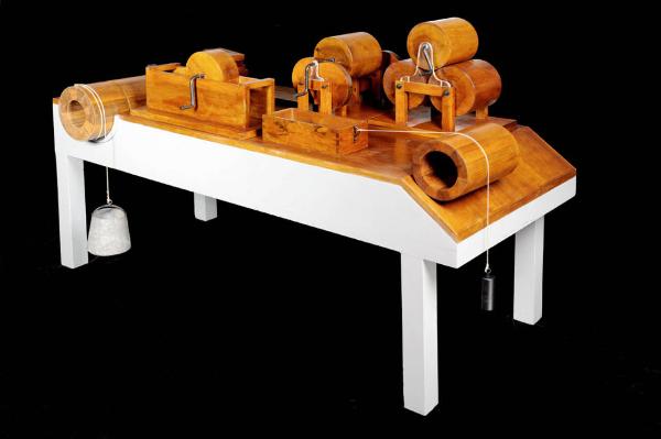 Il modello ricostruisce un banco per esperienze sull'attrito, assemblando disegni di provenienza diversa.