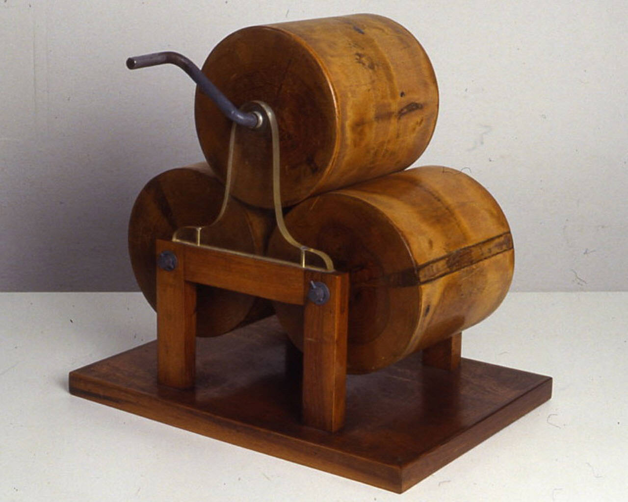 Il modello ricostruisce uno studio di rulli per esperienze sull'attrito. Tre rulli di legno ruotano su assi collegati a una struttura portante, appoggiati gli uni agli altri