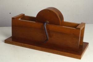 Il modello ricostruisce uno studio di rulli per esperienze sull'attrito. Il rullo è inserito in una cassetta di legno e dotato di una manovella