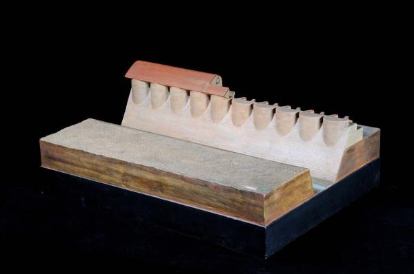 Il modello rappresenta una sezione di cortina fortificata suddivisa in tre elementi fondamentali: la scarpata, i salienti e la copertura.