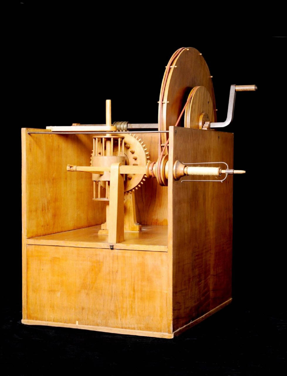 Il modello è costituito da una struttura di legno su cui sono posti, nell'ordine: una manovella che mette in moto una ruota,a sua volta collegata tramite una cinghia di cuoio a un albero; l'albero è costituito da due parti inserite una nell'altra, collegate rispettivamente al fuso e all'aletta. La grande ruota mette in moto anche una vite senza fine, che ingrana alternativamente due pignoni collegati a loro volta a una barra e all'albero del fuso.
