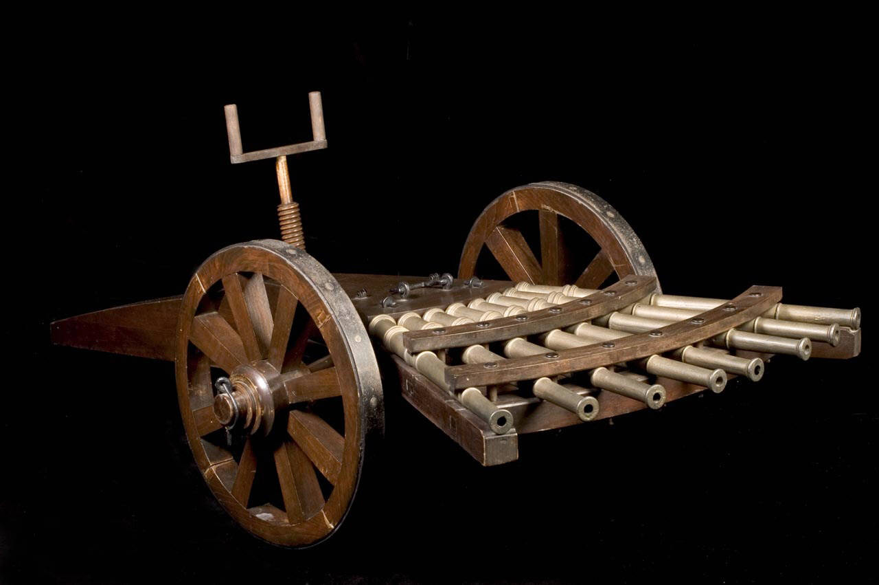 Questo modello rappresenta una batteria di cannoni costituita da 8 piccole bocche da fuoco ordinate a ventaglio. La coda massiccia è necessaria per equilibrare il peso delle canne. L'affusto del cannone è regolabile grazie a una vite senza fine.