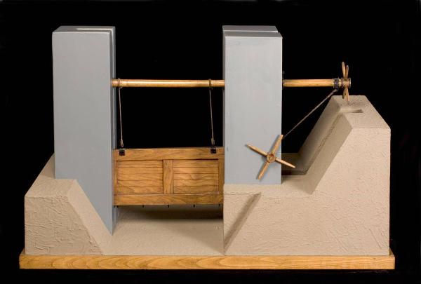 Il modello è costituito da una struttura di legno che simula la sezione di un corso d'acqua. Tra sue spessi pali scorra una paratoia di legno, alloggiata in due guida dei pali stessi. La paratoia è unita tramite due funi a una barra basculante su un perno e collegata a una manovella di azionamento