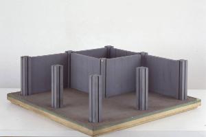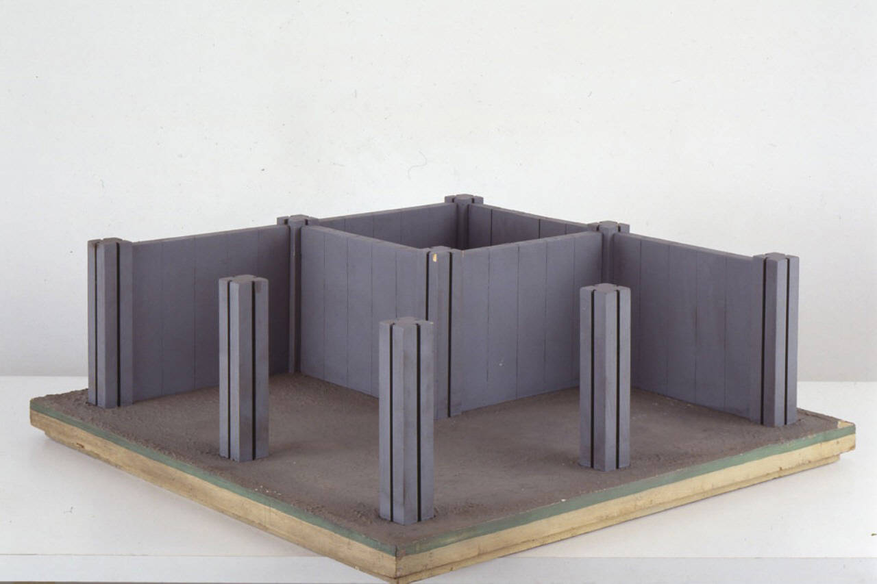 Il modello è costituito da una base di legno, sulla quale sono montati nove pilastri dotate di fessure. Tra quattro di questi sono incastrati segmenti verticali che formano un cassone chiuso di palancolate.