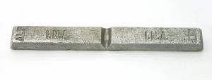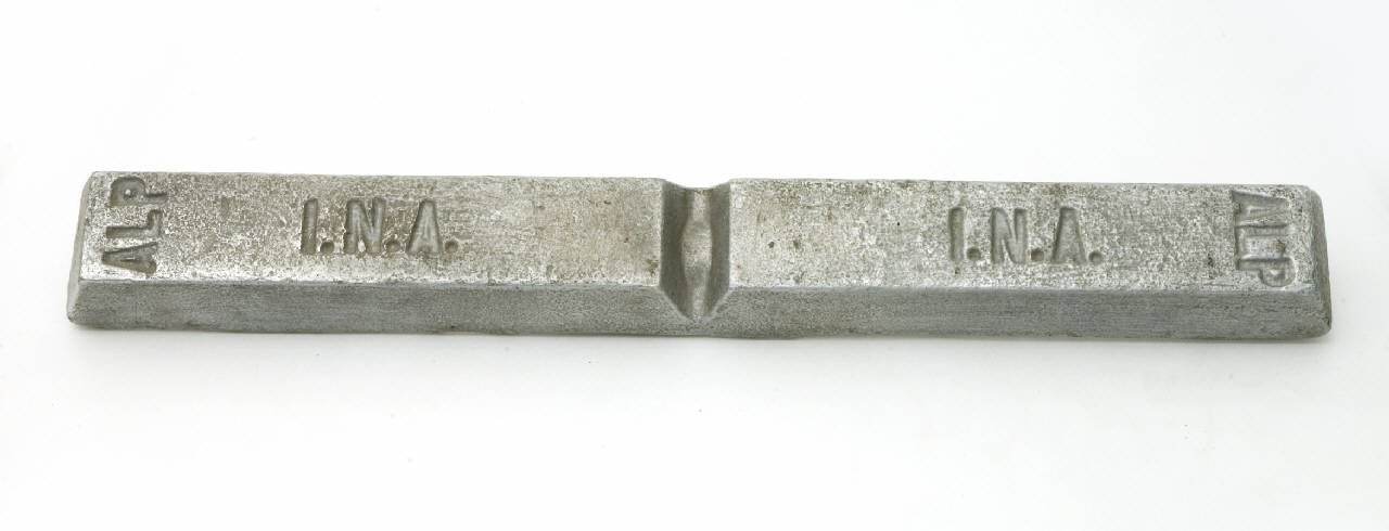 Fusione in alluminio, puro al 99.58%. A forma di parallelepipedo sagomato, è divisa in due blocchi contigui. Su ogni blocco sono riportate le iscrizioni I.N.A. e ALP.