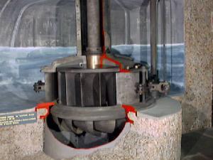Turbina Francis ad asse verticale della potenza di 305 HP. E' composta da girante (completa), distributore (spaccato) e asse di trasmissione in acciaio.