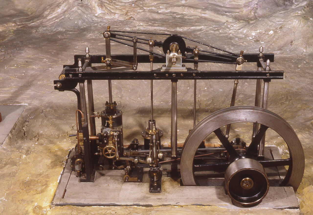 Questo modello in scala della macchina di Watt è costituito da una parte termica e organi di trasmissione.\nLa parte termica è costituita da un cassetto di distribuzione (all'uscita della caldaia, non presente) e un regolatore centrifugo che regolano l'immissione del vapore in un cilindro con stantuffo.\nQuesto è collegato, tramite un'asta rigida, ad un parallelogramma, parte di un bilancere oscillante.\nL'altra estremità del bilancere è collegata, mediante un'asta rigida, ad un sistema biella-manovella che mette in rotazione un volano.\nIl volano è montato coassialmente su di un albero motore che ospita anche una puleggia.\nE' inoltre presente un motorino che permette di azionare il modello e simulare il funzionamento della macchina.