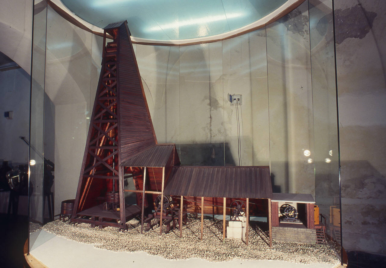 Questo modello di derrick americano è costituito da una torre di perforazione ed un motorino di avviamento collegati da un sistema di trasmissione del moto. Questa riscostruzione è sistemata su una base in legno ricoperta di sassolini, a fini espositivi.\nIl motorino elettrico è collegato, mediante un sistema di trasmissione a cinghia, ad una puleggia. Questa trasmette il moto ad una corda alla quale è collegato l'asse di perforazione, costituito da aste cave poste all'interno della torre. Le aste terminano con degli scalpelli, all'interno del pozzo di perforazione.\nIn prossimità della torre, esternamente ad essa, si trovano due vasche di raccolta dei fanghi di perforazione.
