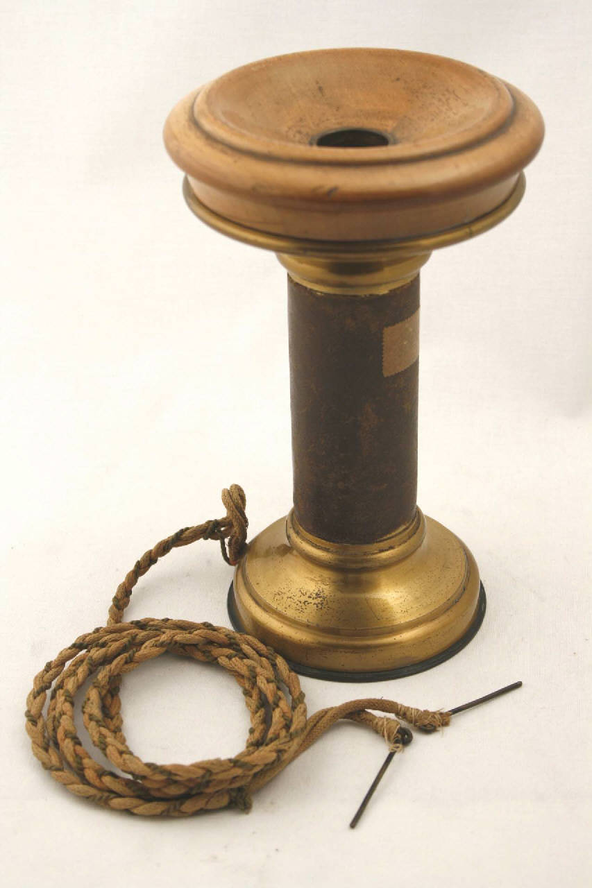 E' costituito da un piedistallo in legno e ottone, una custodia cilindrica metallica ricoperta di pelle e un padiglione circolare in legno e ottone. All'interno della custodia cilindrica è presente un magnete ad U, i cui poli recano due nuclei in ferro dolce sui quali sono inseriti due elettromagneti. I capi di questi elettromagneti terminano ai fili fuoriuscenti dal piedistallo. Una vite posta sul fondo tiene in posizione il magnete ad U e permette la regolazione della distanza della membrana in ferro dolce contenuta all'interno del padiglione, in corrispondenza degli elettromagneti.\nManca il fischietto che, se posizionato nell'imboccatura, permetteva di dare l'avviso di chiamata prima della conversazione.