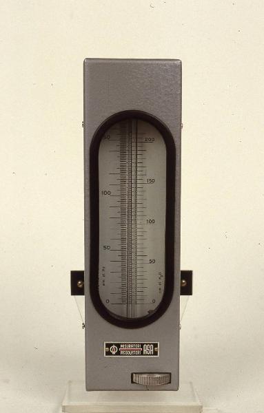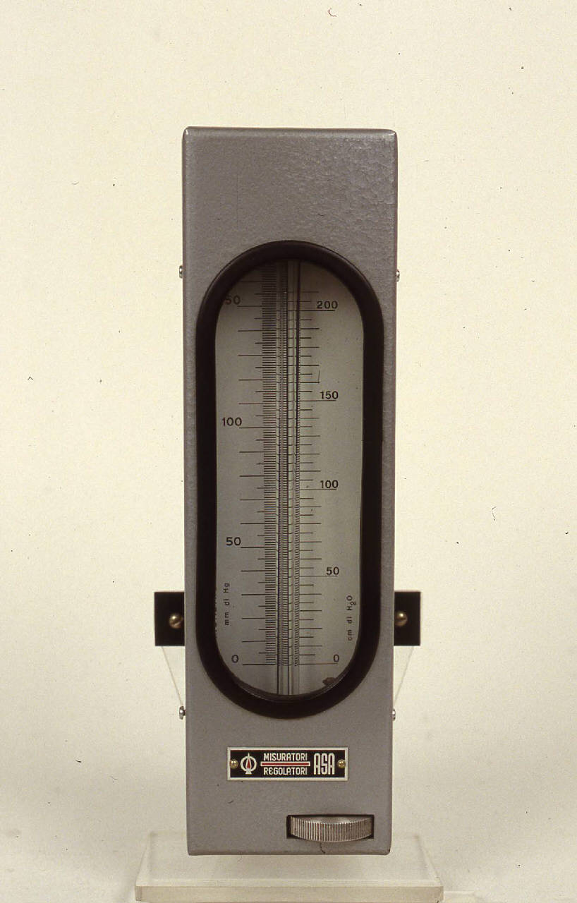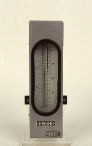 Lo strumento è costitutito da una scatola metallica rettangolare chiusa superiormente da un coperchio. Al centro di quest'ultimo è situata una finestra in vetro di forma approssimativamente ellittica lunga quasi quanto la lunghezza totale dello strumento stesso. Attraverso la finestra è possibile effettuare la lettura della scala sottostante. Questa è composta da due scale distinte. Quella a sinistra permette la lettura di valori compresi tra 0 e 150 mm di Hg con indicazioni numeriche ogni 50 e tacche ogni unità, quella di destra invece permette letture comprese tra 0 e 200 cm di H2O, con indicazioni numeriche ogni 50 e tacche ogni 5 unità. Sulla parte laterale della scala è riportato il nome dello strumento e la marca del produttore. Al di sotto della finestra di lettura, nella parte inferiore del coperchio, si trova una rotella di regolazione. E' inoltre presente un'etichetta metallica sulla quale sono stampati il nome del produttore e il logo della ditta. Nella parte inferiore sono posizionati i collegamenti all'impianto da misurare. E' inoltre presente una placca metallica per il fissaggio in verticale.