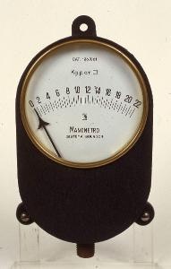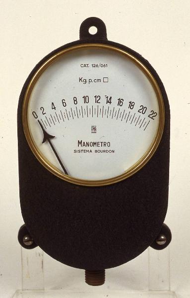 Lo strumento di misura, di forma circolare, è custodito in un contenitore di forma ellittica ed è posizionato nella parte superiore dello stesso. Nella parte inferiore è presente il connettore per l'inserimento nel circuito da misurare. Lo strumento è dotato di una scala graduata con valori compresi tra 0 e 22 Kg. p. cm., tacche ogni 0.5 e indicazione numerica ogni 2. Sul retro lo strumento è chiuso da un vetro in plastica per consentire la visione del meccanismo di funzionamento. Questo è costituito da un tubo piatto in rame, di forma approssimativamente circolare, l'estremità del quale è vincolata alla lancetta di misurazione. Sono presenti tre punti per il posizionamento su di un quadro di dimensioni superiori.\nLo strumento è collocato su un basamento in plastica a soli scopi espositivi.