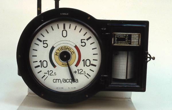 Lo strumento è dotato di un corpo principale di forma circolare sul quale è fissata la scala di lettura con valori compresi tra -12,5 e 12,5 cm/acqua. La lancetta di indicazione è collegata per mezzo di un sistema di leve ad un pennino che fuoriesce lateralmente e riporta la propria posizone su un foglio millimetrato. Tale foglio è posizionato su un cilindro che può ruotare, per mezzo di un meccanismo orario, compiendo un giro completo in 24 ore. Questo cilindro è inserito in una scatola posizionata lateralmente allo strumento principale e protetta da uno sportello apribile. Nella parte posteriore dello strumento è posizionato il sistema di collegamento al circuito da misurare. Una bolla sferica consentiva il perfetto posizionamento dello struemnto. Lo strumento è posizionato su un supporto metallico per l'esposizione.