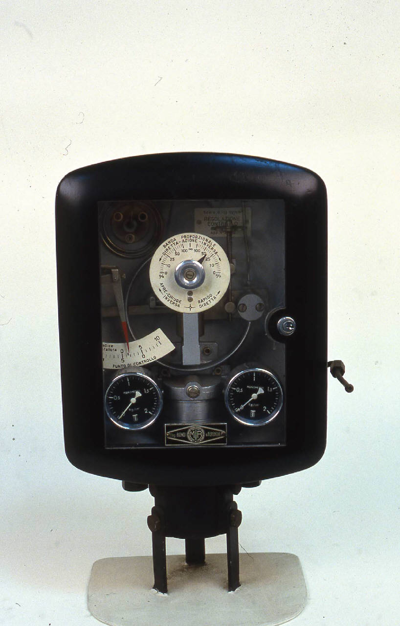 Lo strumento è composto da una scatola metallica a forma parallelepipeda chiusa da un coperchio in vetro. All'interno sono presenti due manometri per il controllo della pressione del circuito a cui lo strumento veniva collegato. I manomentri, identici, hanno scala di lettura compresa tra 0 e 2 Kg/cm2. Oltre ad essi sono presenti alcuni meccanismi per la regolazione ed il controllo del funzionamento.Nella parte posteriore sono posizionati i connettori per il collegamento al circuito da regolare. Lo strumento è sostenuto da un supporto metallico a soli scopi espositivi.