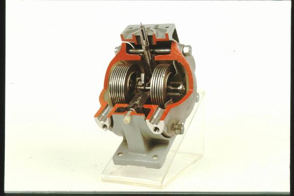Oggetto dalle funzioni didattico esplicative. Il corpo principale è costituito da un cilindro in metallo sezionato in modo da consentire l'osservazione del meccanismo interno. La parte interna è suddivisa in due camere simmetriche ciascuna delle quali contiene un regolatore a soffietto. I due regolatori sono posizionati assialmente secondo la lunghezza dello strumento. Ognuna delle due camere è dotata di un condotto a vite per il collegamento al circuito esterno. Nella parte centrale un sistema di piccoli pistoni, regolabili micrometricamente dall'esterno, consentiva le regolazioni fini per il funzionamento. Lo strumento è dotato di una piastra metallica per il fissaggio ed è collocato su una struttura in plastica trasparente per fini espositivi.