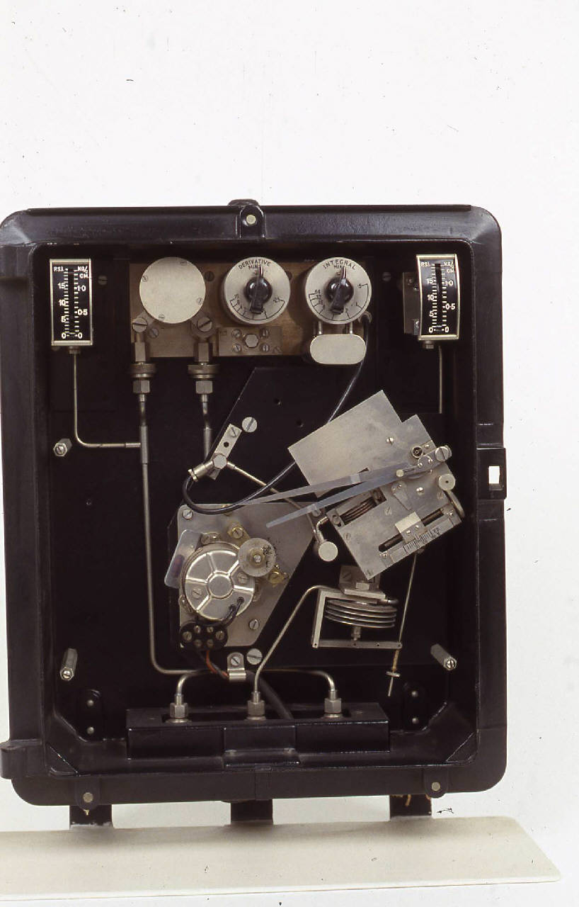 Lo strumento ha forma rettangolare. La parte anteriore costituisce il coperchio di chiusura. Nella parte centrale è ricavata una finestra di forma circolare protetta da vetro. E' così possibile osservare il meccanismo di funzionamento interno. Nella parte superiore dello sportello due piccole finestre rettangolari, posizionate ai lati opposti, consentono la lettura di due manometri identici a doppia scala verticale per lettrue comprese tra 0 e 20 psi e tra 0 e 1,5 Kg/cm2. Nella parte superiore del coperchio è avvitata centralmente una targa metallica con il nome della ditta produttrice. Il coperchio è incernierato sul lato sinistro ed è dotato di chiusura a chiave. Questo esemplare sicuramente aveva una funzione didattica ed esplicativa perchè manca parte del piatto di forma circolare sul quale veniva posizionato un foglio di carta millimetrata per la registrazione oraria dei valori misurati. Nella parte centrale dello strumento è collocato il motorino elettrico che regolava la rotazione del disco mentre sul lato destro è situato il meccanismo di registrazione vero e proprio costituito da due lancette indicatrici una delle quali dotata di punta inchiostrata. Una piccola vite micrometrica consentiva la regolazione e la taratura dello strumento. Nella parte superiore sono presenti altri due sistemi di regolazione e controllo azionati per mezzo di due piccole manopole in plastica. Nella parte inferiore sono collocati i collegamenti all'impianto elettrico e al circuito da regolare. Lo strumento è collocato su un supporto in metallo a soli fini espositivi.