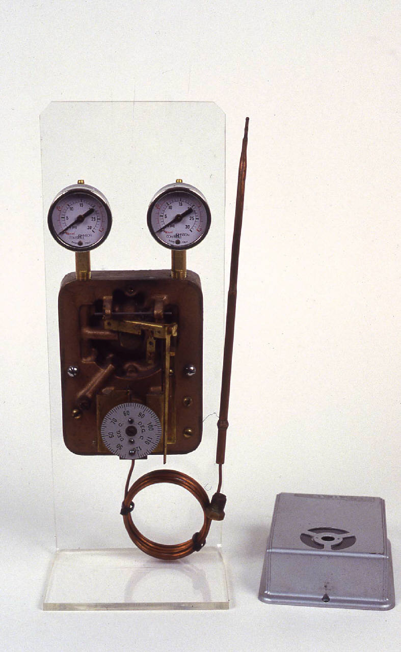 Lo strumento è composto da una parte principale di forma parallelepipeda. Sul fronte dello strumento, nella parte inferiore, una finestrella circolare di vetro permette la lettura di una scala graduata anch'essa circolare, in un range che va fra 45 e 120°C, con tacche ogni unità e indicazione numerica ogni 10. Nella parte superiore dello strumento sono inseritri due tubi verticali in ottone all'estremità dei quali sono collocati due piccoli manometri identici. Questi sono caratterizzati da due scale graduate concentriche. Quella più interna con un'estensione tra 0 e 30 psig, tacche ogni unità e indicazione numerica ogni 5, quella più esterna con estensione tra 0 e 2 Kp/cm2, tacche ogni 0.1 e indicazione numerica ogni 0.5 unità. Dalla parte inferiore dello strumento fuoriesce un tubicino lungo e sottile in rame all'estremità del quale è collegata la sonda di misurazione. La parte posteriore dello strumento è priva di un coperchio di chiusura. E' presente un'etichetta adesiva in carta sulla quale sono riportate indicazioni sull'uso dello strumento. Lo strumento è collocato su un supporto in plastica trasparente a soli scopi espositivi.