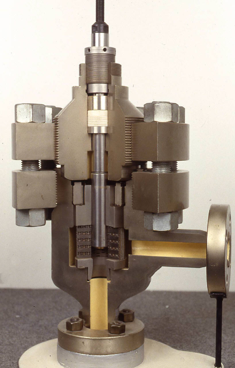 Strumento dalle funzione tipicamente didattico esplicative. Il corpo principale è infatti sezionato in modo da permettere l'osservazione del meccanismo interno di funzionamento. Il corpo principale dello strumento è costitutito da due grosse flange in acciaio, forate assialmente, ento cui scorre la valvola di regolazione del flusso. Questa è costituita da un pistone di forma cilindrica la cui posizione è regolata tramite un asse che fuoriesce dalla parte superiore dello strumento. Lo strumento è dotato di due connettori con collegamento a flangia per l'inserimento nel circuito da regolare. E' presente un supporto metallico per consenitre l'esposizione.