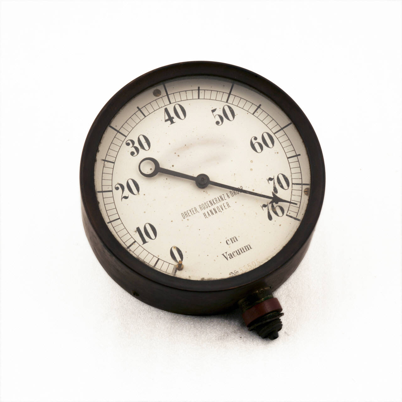 Questo strumento ha forma tipicamente circolare ed il quadrante è ricoperto e protetto da un vetro. La scala, anch'essa circolare, permetteva di misurare quantità comprese tra 0 e 76 "cm Vacuum" ed è suddivisa con tacche ogni unità ed indicazione numerica ogni 10. La lancetta indicatrice è imperniata nel centro del quadrante. Sotto allo strumento è presente un connettore che serviva per il collegamento all'impianto da misurare.
